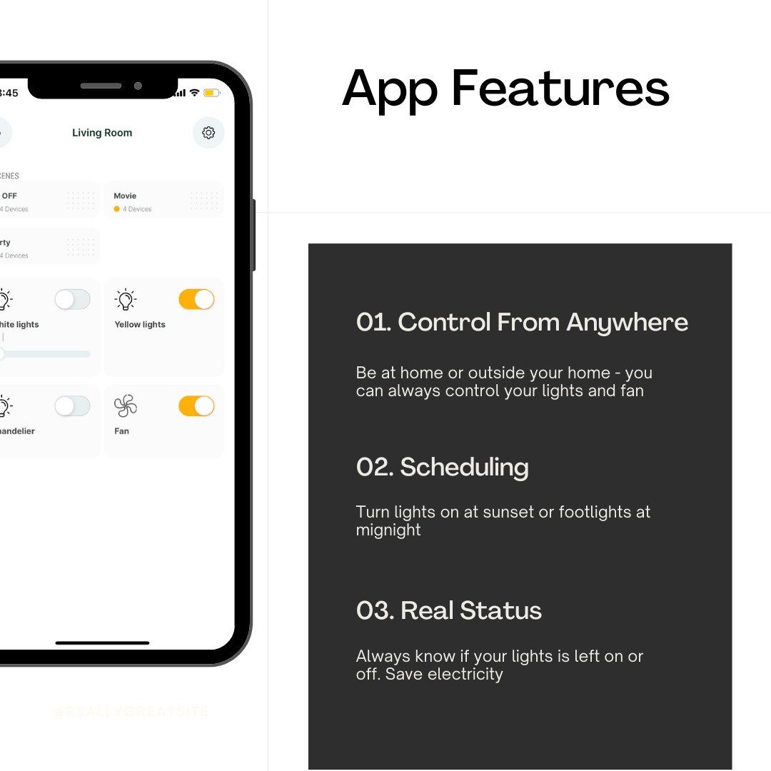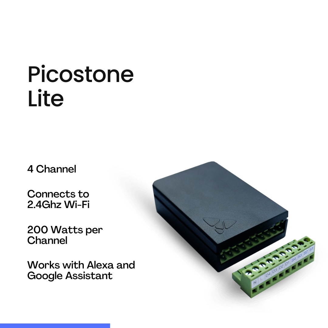 The Picostone Lite is a palm-sized controller that connects to four switches on your switchboard and allows you to operate your lights and fans over the internet through our App from anywhere in the world.